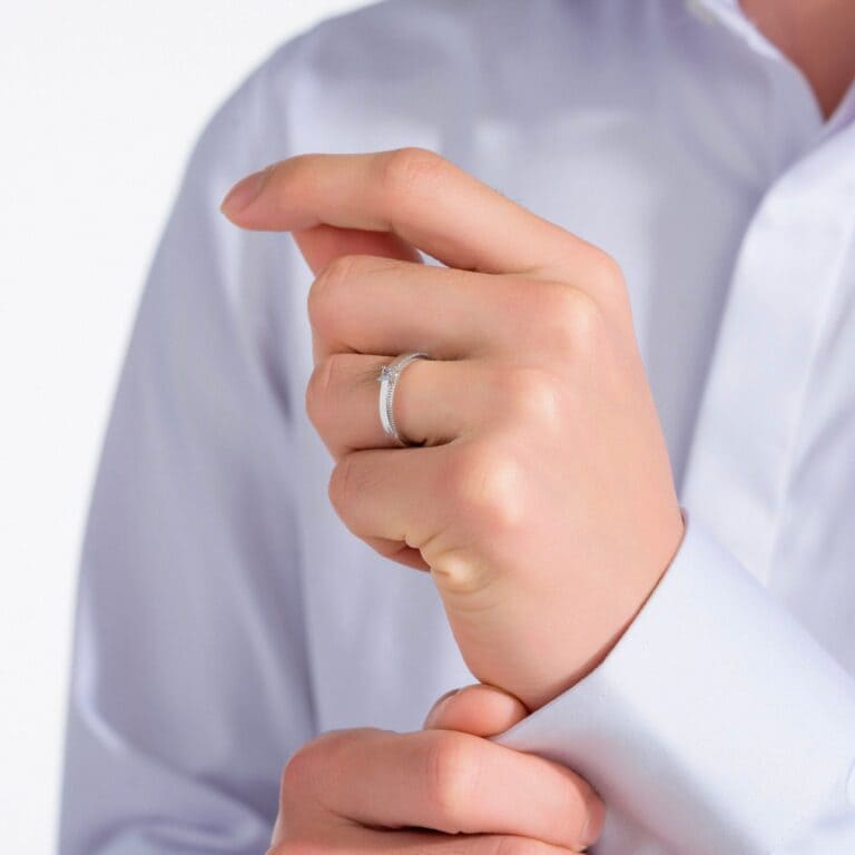 Nhẫn nam mang dáng vẻ vững chắc, được xử lý bề mặt tỉ mỉ tạo cảm giác sang trọng, hiện đại và mạnh mẽ – tượng trưng cho sự che chở và kiên định của người đàn ông.