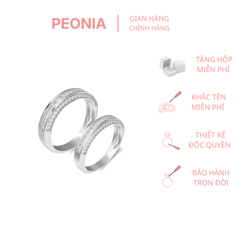 Nhẫn cưới vàng trắng Peonia 14K đá CZ mang trong mình tinh thần ấy: thanh lịch, sang trọng và vẹn tròn – một món quà hoàn hảo dành cho hai trái tim cùng chung nhịp đập.