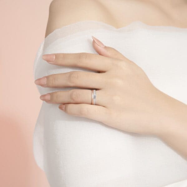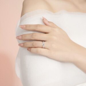 – Nhẫn nữ được đính dọc thân hàng kim cương Lab-Grow nhỏ lấp lánh, tôn lên vẻ kiêu sa và quyến rũ.